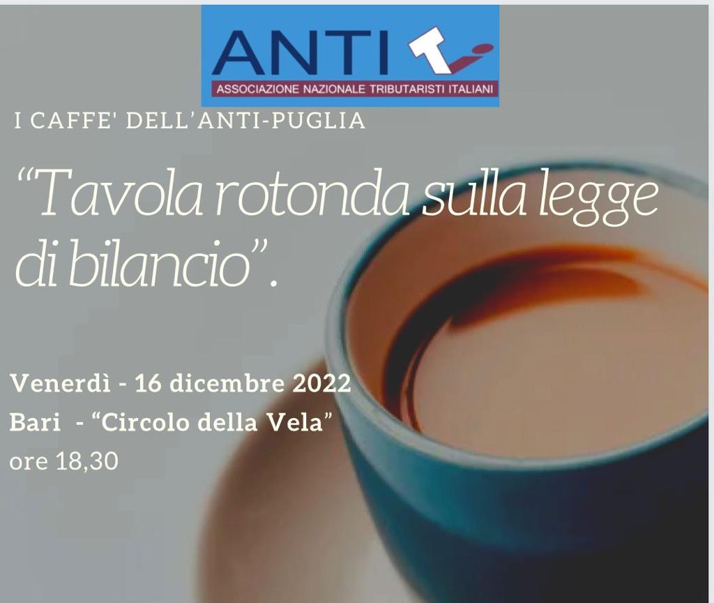 Home Eventi Convegni - ANTI | Associazione Nazionale Tributaristi Italiani Caffè dell’ANTI Puglia – 16 Dicembre Data 16 Dic 2022 Finito! Ora 18:30 - 19:30 Caffè dell’ANTI Puglia – 16 Dicembre Tavola rotonda sulla Legge di Bilancio TweetShareShare Condividi questo evento + Aggiungi a Google Calendar + esporta iCal / Outlook Luogo Bari - Circolo della Vela Piazza IV Novembre, 2, Bari BA Organizzatore ANTI Sezione Puglia Telefono +39 0805019137 – +39 0806456099 Email antipuglia.tributaristi@gmail.com Ora locale Fuso orario: America/New_York Data: 16 Dic 2022 Ora: 12:30 - 13:30